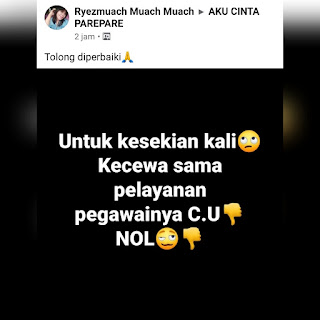 "Untuk kesekian kali, kecewa sama pelayanan pegawainya. Tulis Ryezmuach muach muach via facebooknya yang dibagikan ke grup Aku Cinta Parepare.